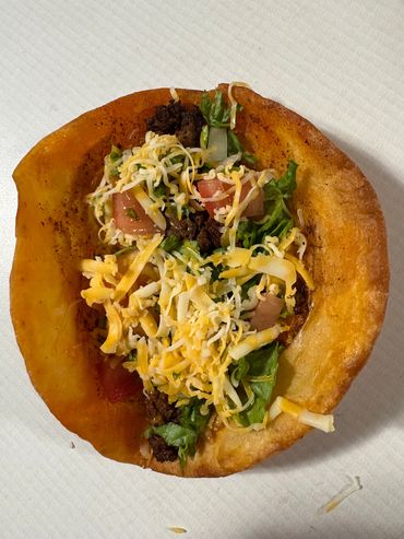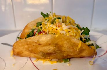 Deep fried flour taco with seasoned beef and beans topped with onions, lettuce, tomatoes and cheese. Served with a 2 oz side of medium spicy salsa.